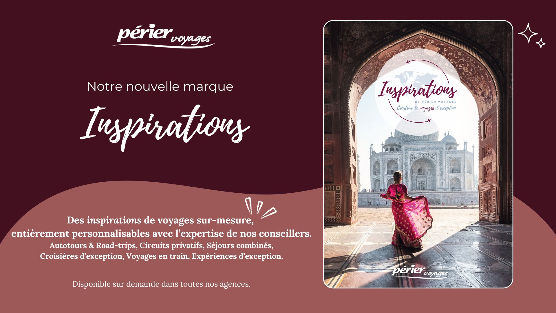 Avec Inspirations, nous vous invitons à repousser les frontières de l’imaginaire. Que vous rêviez d’un road-trip sauvage à travers les grands espaces canadiens, d’un séjour confidentiel dans un Riad de charme à Marrakech, d’une croisière luxueuse en Polynésie ou d’un itinéraire culturel à travers le Japon, notre équipe de conseillers experts est là pour construire, pas à pas, le voyage qui vous ressemble.